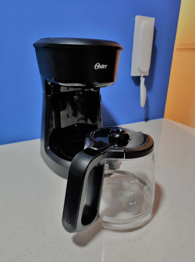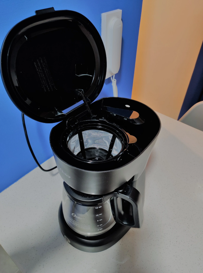 The coffee machine that you will find at your disposal is an automatic drip coffee maker (Auto-Drip Coffee Maker) and does not require the use of paper filters. The coffee must be placed in the metal basket. The water is placed in the tank located at the back.