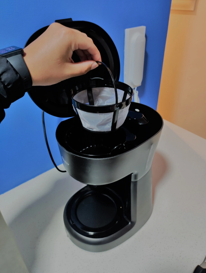 Once everything is in place, you can press the switch located beneath the glass carafe on the front. Just activate it, and the coffee maker will start the process until it automatically stops when the coffee is ready.