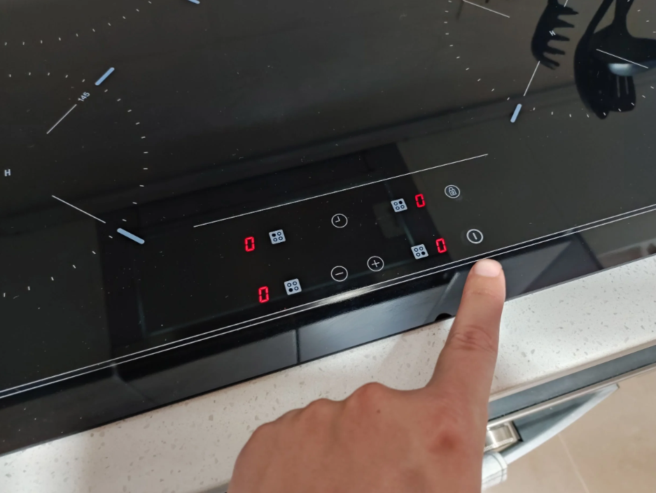 Turning on the cooktop is extremely simple. Once it's unlocked, simply press the button with the universal ignition symbol for one second. When you do this, all the burner icons will display a numeral '0,' indicating that they are all active and ready.